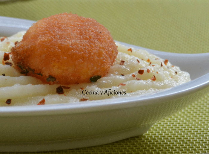 Esta es la tapa estrella de mi cocina este año, la he repetido varias veces y siempre con mucho éxito, con distintos acompañamientos y en diferentes presentaciones, es genial ya que la yema se queda muy crujiente por fuera pero cruda por dentro, de esas de “mojar pan”, una autentica delicia.