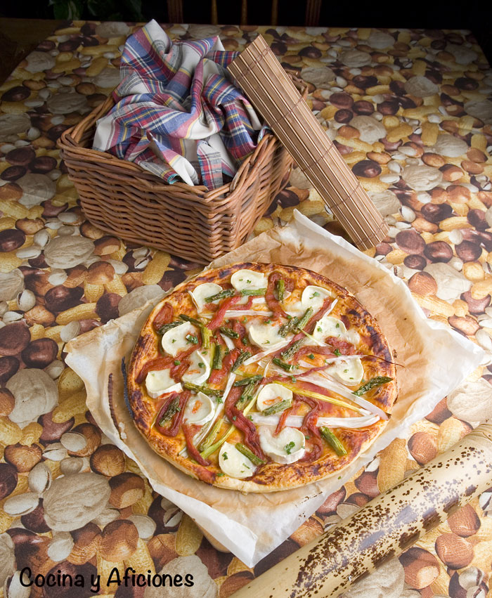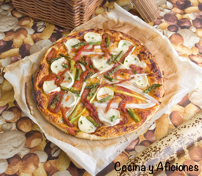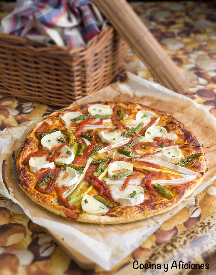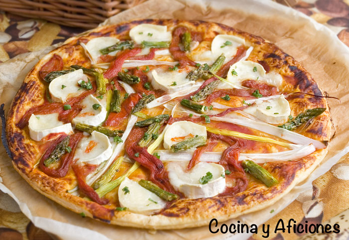 - Esparcimos por toda la superficie los espárragos y las tiras de pimiento y entre medias colocamos las rodajas de queso de cabra.