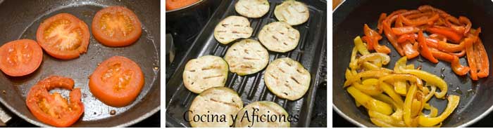 - Lavamos y cortamos en finas rodajas la berenjena, los pimientos en tiras y el tomate lo pelamos y luego lo loncheamos.