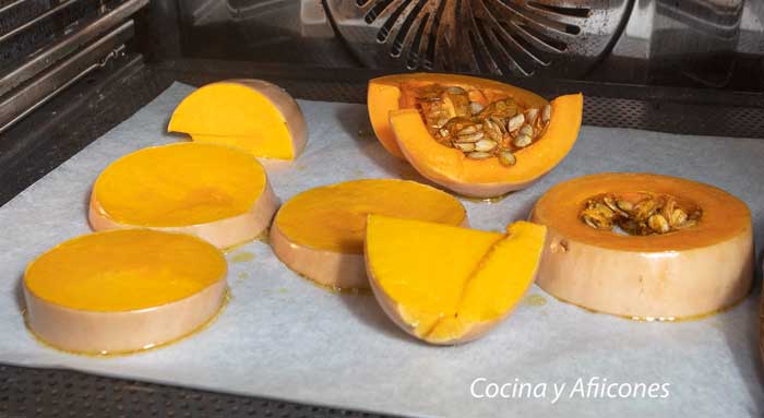 3. Ase en el horno durante hasta que la calabaza esté tierna al pincharla con un cuchillo.