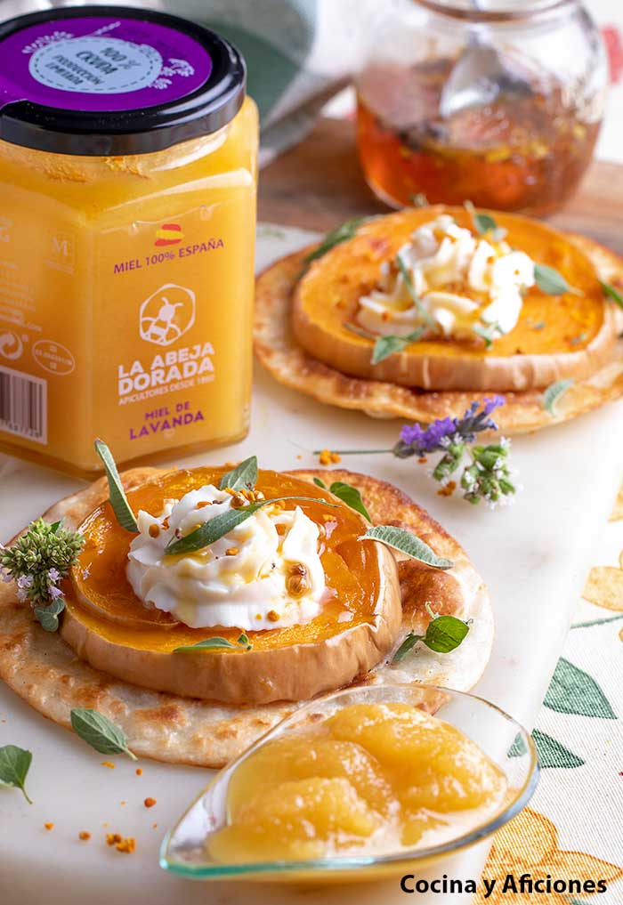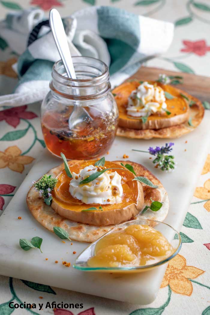 Coloca encima de cada tortita una rodaja de calabaza, nápala con la ricota aromatizada con miel, riega con más miel especiada y esparce por encima el polen.