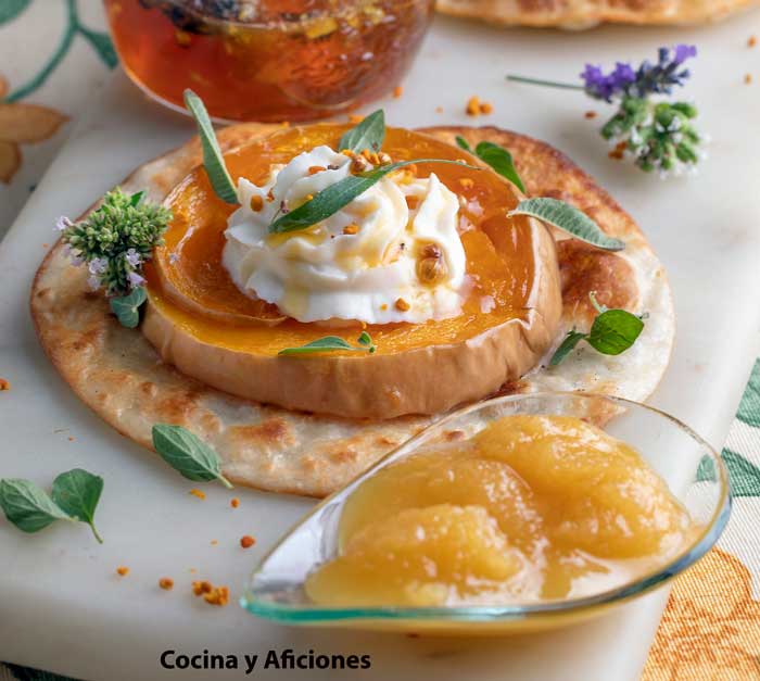 Presentación de mini tartas ecológicas de calabaza con miel especiada y ricotta