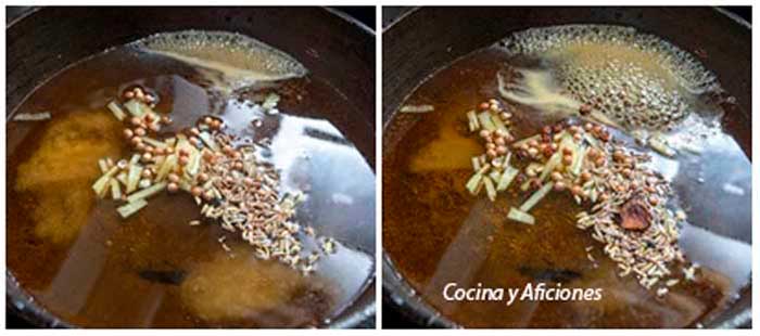 2. Repite la operación con el zumo de naranja, y con el Jerez, añade a la sartén y mezcla con unas varillas.