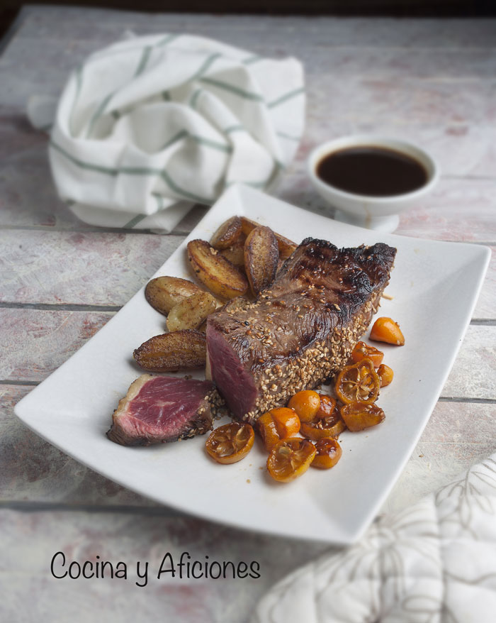 Servimos el tataki acompañado de las patatas y cítricos caramelizados trinchamos en la mesa.