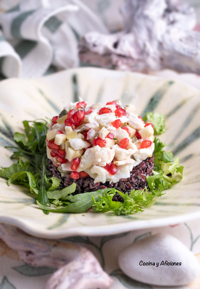 Timbal de salpicón de lubina de Aquanaria con arroz negro venere, receta sencilla pero de lujo.