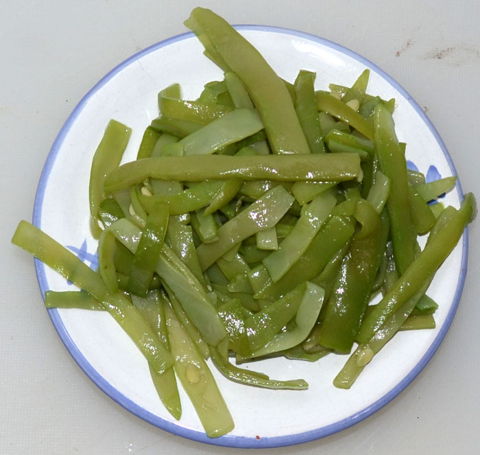 – Pelamos las judías verdes quitándole las fibras laterales y las puntas.