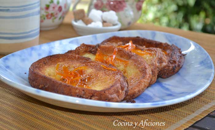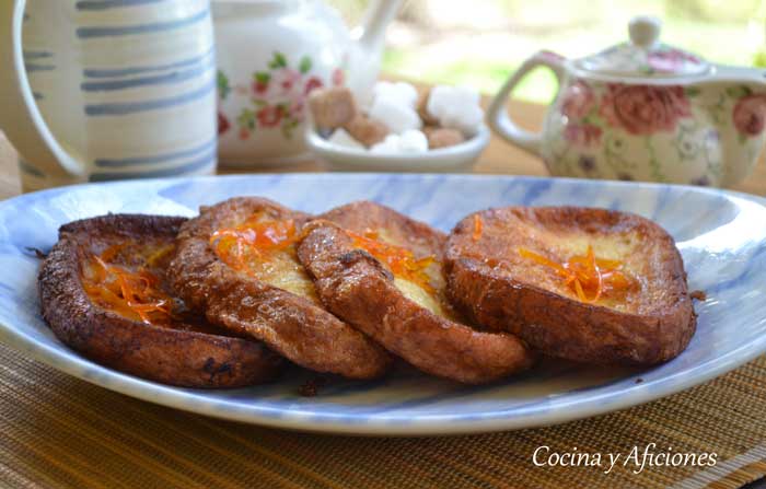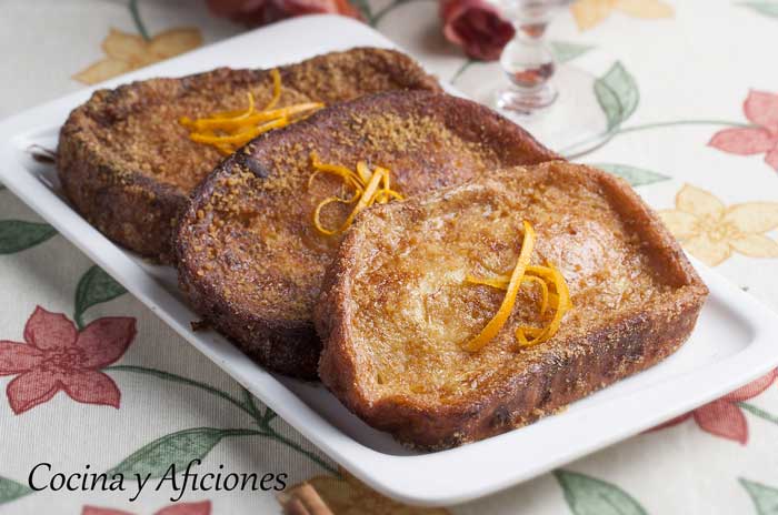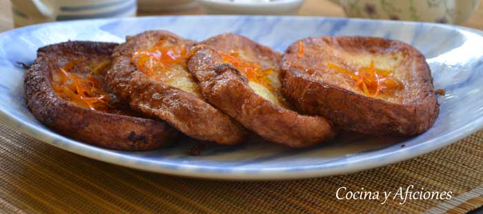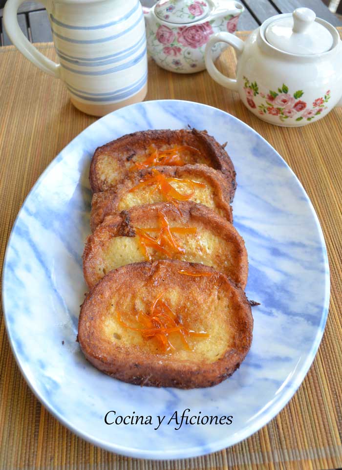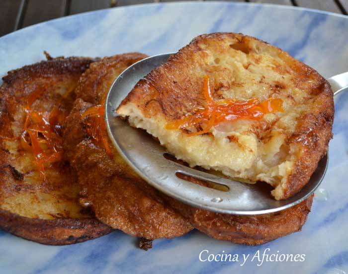 La otra tanda de torrijas la termine con un almíbar muy ligero y las pieles de la naranja que había utilizado para preparar la infusión de vino. Para sacar las pieles sin problemas no tienes mas que acercarte a aun tienda de cocina y comprar un pelador especial para este menester. Estas tiras de naranja le aportan a la torrija un sabor estupendo.