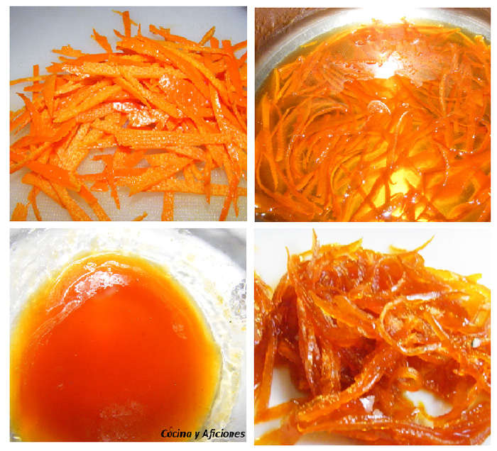 –          Pon el almíbar sin palitos de naranja en un plato hondo