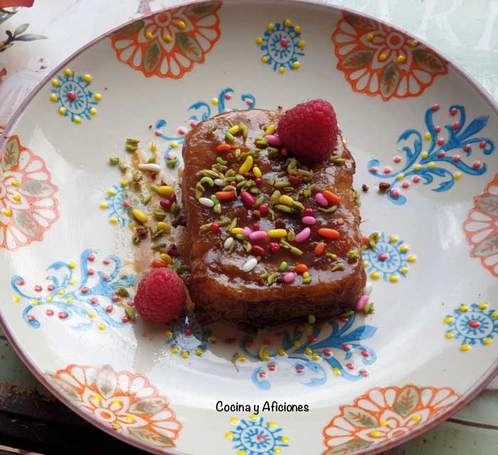 –        Colocamos la torrija en el plato de servicio, la napamos con el caramelo, una capa que la cubra bien.