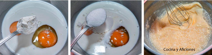 - Junta en el vaso de la batidora los huevos, la leche, el azúcar y la sal