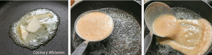 - Calienta una nuez de mantequilla en una sartén antiadherente a fuego suave, que no tome color.