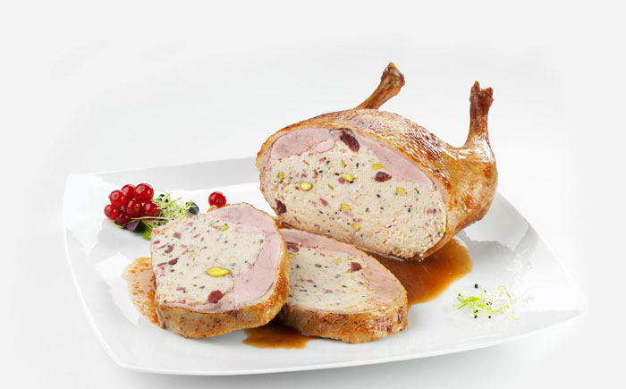 Esta receta puede comprarse ya preparada o realizarse a mano. En el segundo caso solo necesitarás tres ingredientes además de la salsa, que pueden conseguirse fácilmente: un pato fresco entero, foie fresco extra de pato y trufa. La idea es rellenar el pato entero con los otros ingredientes de forma que cada bocado combine todos los sabores al mismo tiempo.