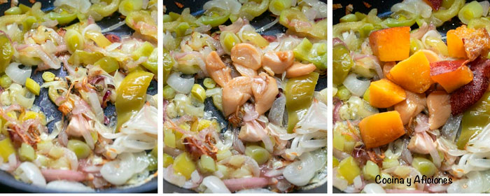 - Preparamos un sofrito con las cebollas, dejamos que suden y se cocinen hasta que estén transparentes, incorporamos los ajos asados y el pimiento verde picado.