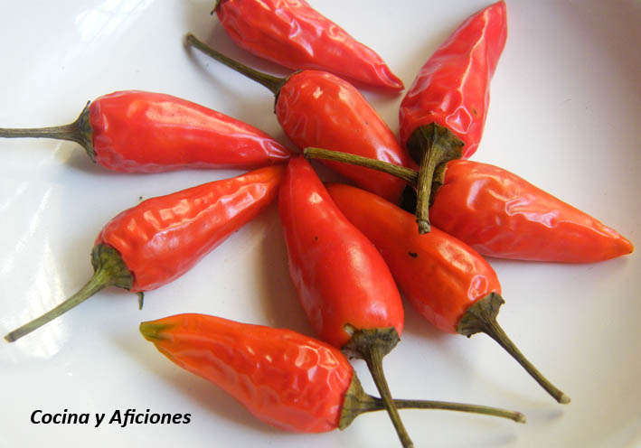 La vinagreta de guindillas es una maravilla que hay que racionar, ya que pica y cuando digo que pica es que pica bastante. En esta ocasión he utilizado autentico chile de árbol mejicano, que son unas preciosas guindillitas (son pequeñitas) verdes o rojas, de color intenso, también se las conoce como pico de pájaro y para suavizar unas guindillas verdes de mi huerto que son como pimientos verdes alargados que no pican nada, como no se la variedad en la receta las voy a sustituir por pimiento verde italiano.