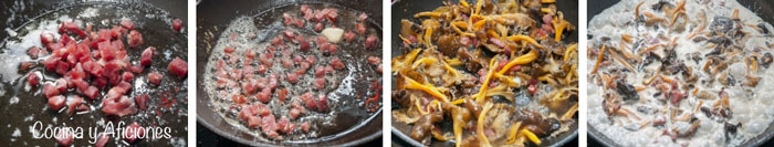 - En la misma sartén saltear las setas, el ajo y las chalotas hasta que estén doradas, añadir las setas y rehogar a fuego vivo.